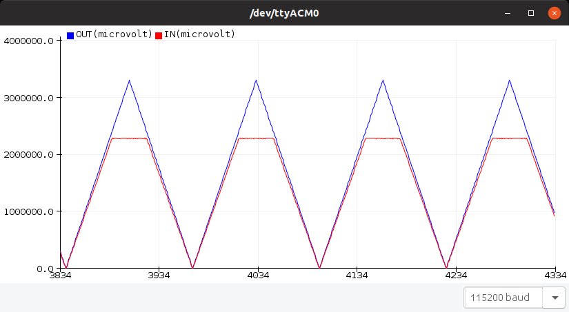 Remember the red truncated wave is the actual voltage on the output pin, the blue wave is the set output voltage which is manifestely not obtained at times. Note that the DAC and ADC measures has been converted to microvolts. The sketch, dac2dac_v.ino