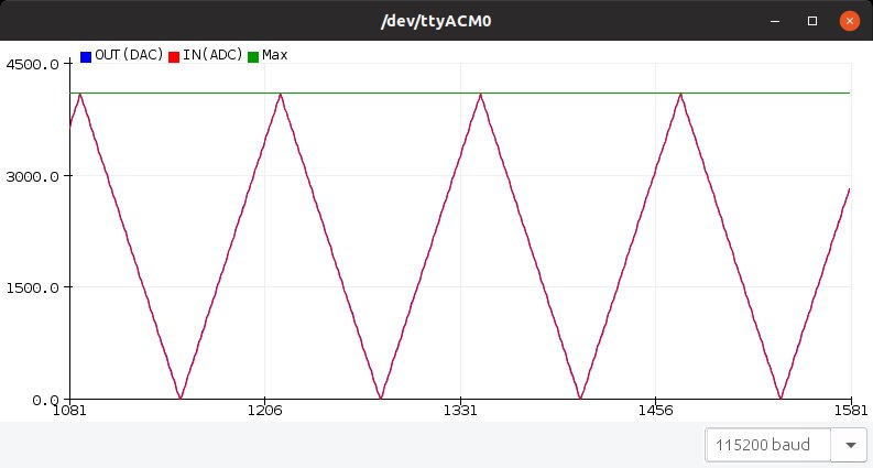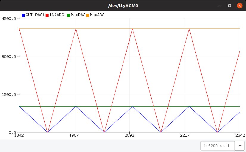 The graph could be surprising on first look, but remember this plot is not a direct measure of the output and input voltages. The triangular blue wave shows the numeric data written to the DAC to specify the output voltage on pin 0. The red wave (or higher amplitude wave, for colour-blind readers) shows the numeric data read from the ADC on pin 8 as it converts the output voltage read on pin A1. The ADC has a 12 bit resolution, so it divides the 0 to 3.3 voltage range into 4096 steps. Writing 64 to the output DAC will result in an output voltage of 0.2064 (=3.3*64/1023). The ADC reads that voltage as 4095*0.2064/3.3 = 256.12, which is 4 times 64 (when ignoring rounding and measurement errors). The input voltage is quite close to the output voltage notwithstanding the scale factor. This can be verified by scaling either the DAC or ADC measure. When SCALE is defined the output value is scaled and the result is the following graph.