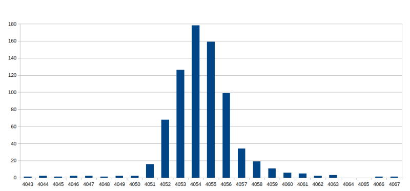 While the returned value when measuring 0 volts was fine, there was quite a bit of variation in the values returned when measuring Vcc as can be seen with the following histogram established after 741 measurements.