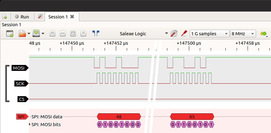 I added serial print statements to see the "Hello world" message as hexadecimal values to make it easier to verify that the message is indeed printed on the SPI bus.