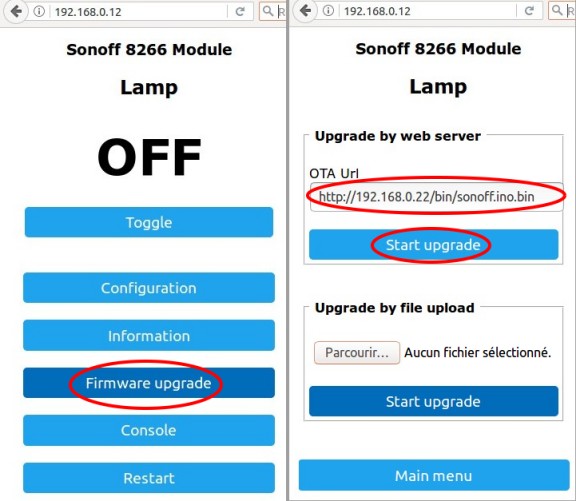 The next section shows how to upgrade the switch firmware by uploading a file from the desktop computer. The rest of the post is about installing a Web server on the Raspberry Pi hosting the home automation system in order to upgrade the firmware by using a web server.