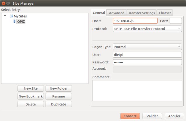 Adding the OPiZ to the list of sites in FileZilla was not a problem
