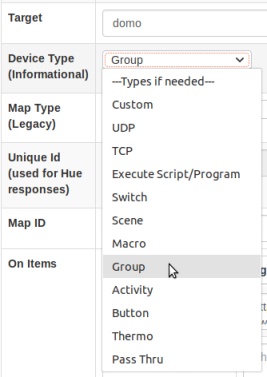 Once these three values are set, two buttons must be pressed. First the button to the right of the fields and then the button at the top of the page. As soon as that button is pressed, HA Bridge pops up a "wait until initialization is completed" message. I found it necessary to refresh the page after that message disappeared and then a new button/tab appeared: Domoticz Devices. Clicking on it, reveals list containing all devices, groups and scenes defined in Domoticzs.