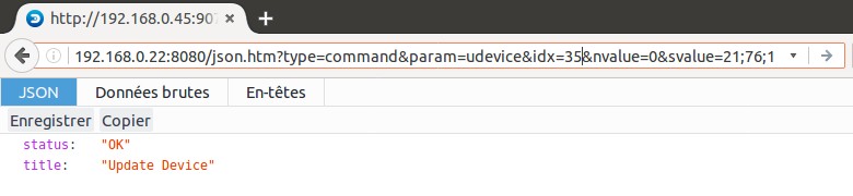 http://192.168.0.22:8080/json.htm?type=command¶m=udevice&idx=35&nvalue=0&svalue=21.2;76.7;1S'il n'y a pas de problème, le statut sur la page retournée devrait être "OK".