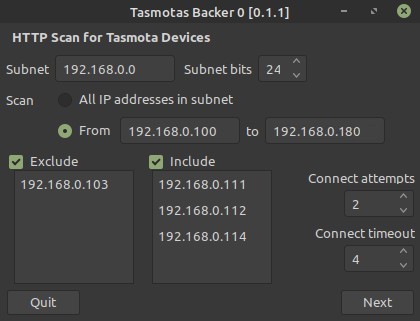 It is possible to exclude some IP addresses known not to be assigned to Tasmota devices in the appropriately named Exclude box. The Exclude check box must be checked otherwise the list of IP addresses in the box is ignored and they will be scanned if they fall in the interval. If a subrange of the subnet will be scanned it is possible to scan IP addresses outside the range by adding them into the Include box. To edit the content of either of these boxes, double click on them.