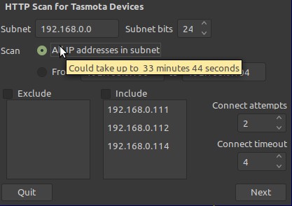 - When the faster MQTT based search for Tasmota devices seems to miss devices then a longer scan of all IP addresses can be undertaken.