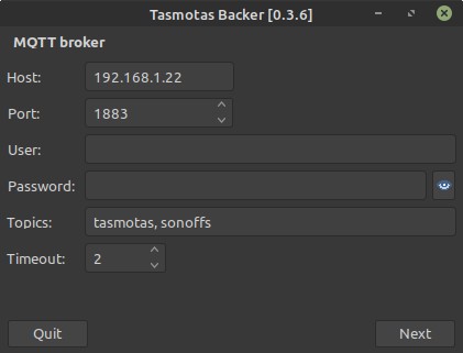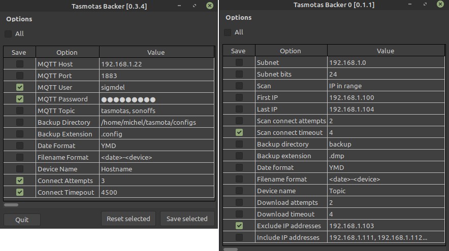tasmotasbackupwhich finds Tasmota devices through an MQTT broker. This version uses themosquittolibrary which may be difficult to install on some systems. The advantage of this version is the speed at which Tasmota devices are found. On the other hand, devices that are not configured to use an MQTT broker or that have a broken MQTT configuration will not be found.tasmotasbackup0which finds Tasmota devices by scanning all IP addresses. This version which only uses HTTP requests to find Tasmota devices does not require any library or third party server. The scan to find devices can be considerable longer than using an MQTT broker. However it may find Tasmota devices that are not configured to use an MQTT broker or that have a broken MQTT configuration.
