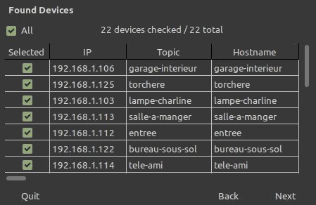 As Tasmota devices are found they are added to a list on the second screen of the utility, whichever version is used. Besides the device IP address, the device hostname and its MQTT topic, which by default would be something like tasmota_495A64, are displayed. On my Tasmota devices, the MQTT topic and the hostname are the same as shown next. Both of these are displayed because it will be possible to choose one or the other to form the name of the file in which the device configuration will be saved.