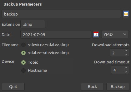 The first option is to specify in which directory the backups will be saved. The second option is the file extension appended to each file. By default it is .dmp which is the extension used by the Tasmota firmware, but as can be seen it has been modified to .config in this instance. The date which is added to the file can be set to a value different from the current date. This is probably something that should not be done. To the right, the format of the date can be specified. There are 3 choices: