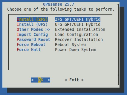 *** OPNsense.internal: OPNsense 25.7 (amd64) *** LAN (igcO) -> v4: 192.168.1.1/24 WAN (igc1) -> [...] Welcome! OPNsense is running in live mode from install media. Please login as 'root' to continue in live mode, or as 'installer' to start the installation. Use the default or previously-imported root password for both accounts. Remote login via SSH is also enabled. FreeBSD/amd64 (OPNsense.internal) (ttyv0) login: