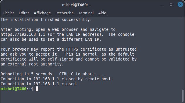 L'installation s'est terminée avec succès.Après le démarrage, ouvrez un navigateur web et accédez à https://192.168.1.1 (ou à l'adresse IP du réseau local). La console peut également être utilisée pour définir une autre adresse IP du réseau local.