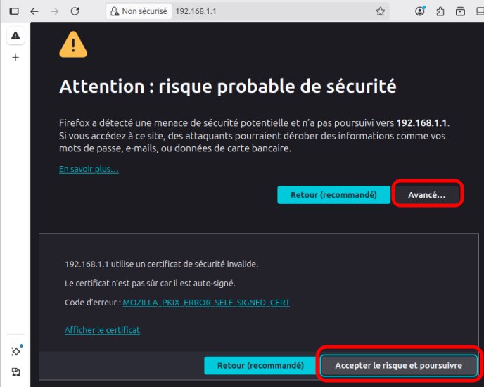 Il faut passez outre à cet avertissement en cliquant sur le bouton Avancé puis en cliquant sur Accepter le risque et poursuivre quand l'encadré est affiché. La procédure est sensiblement la même lorsqu'un autre navigateur est utilisé.