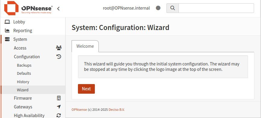 rootpuis son mot de passe qui seraopnsenseou celui spécifié à la fin de l'installation. Une fois ces informations saisies, cliquez sur le bouton [Login] pour accéder au gestionnaire Web d'OPNsense.Après un message de bienvenue, dont l'affichage est tellement court qu'une capture d'écran n'a pas été possible, l'assistant pour la configuration du système démarre.