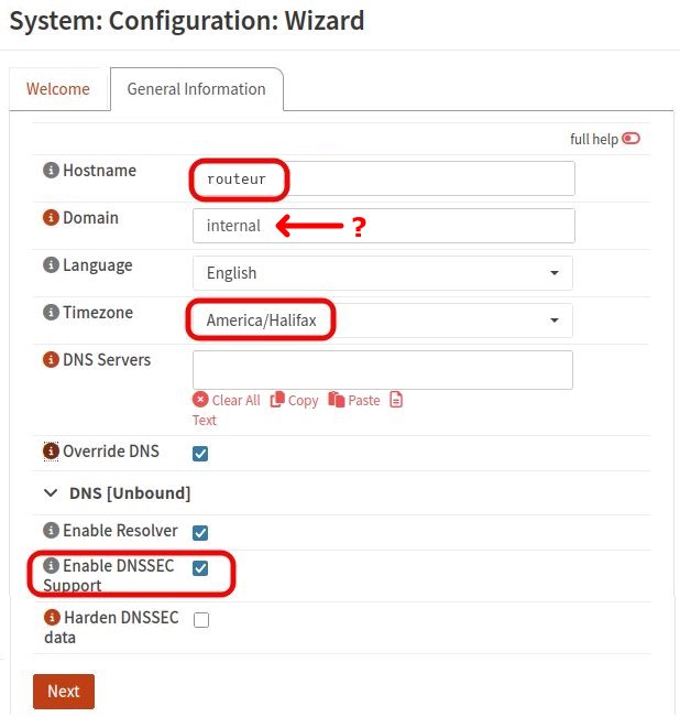 routeur.internal, devrait constitué un nom de domaine complet pouvant être traité par le système de noms de domaine (DNS). L'aide de OPNsense au sujet du domaine dit Do not use 'local' as your internal domain name. It is reserved for and will interfere with mDNS (avahi, bonjour, etc.). Instead, use the special-use domain internal or home.arpa, also to avoid DNSSEC validation issues. e.g. internal, name.internal. Alors queinternaln'est pas parmi les domaines spéciaux (RFC 6761),home.arpas'y trouve (voir RFC 8375 aussi). En revanche, le domaineinternalest proposé dans A Top-level Domain for Private Use où l'on fait la distinction entre un réseau résidentiel et un réseau privé. Je n'ai ni l'expérience ni les connaissances me permettant de faire une recommandation au sujet du domaine. Tant queinternaln'est pas un domaine de premier niveau, il ne devrait pas y avoir de problèmes avec ce domaine proposé par défaut. Il a été très facile de passer du domaineinternalau domainehome.arpaplus tard après la configuration initiale à la page de configuration System: Settings: General.Il serait plus logique de sélectionner le français comme langue de l'interface Web. Toutefois cette option n'aura aucun effet pendant l'utilisation de l'assistant de configuration. Si l'on désire fonctionner en français on peut modifier directement la langue dans System: Settings: General puis cliquer sur le bouton [Save] au bas de cette page. Quand le message Les modifications ont été appliquées avec succès. est affiché, on peut redémarrer l'assistant de configuration Système: Configuration: Assistant. Dès lors les dialogues seront principalement en français contrairement à ce qui sera affiché ci-dessous.