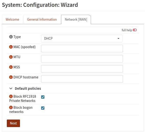 routeurtel que précisé au tout début du processus.On peut redémarrer l'assistant de configuration en tout moment depuis la page System: Configuration: Wizard, mais on devrait probablement éviter tout recours additionnel à l'assistant de configuration. Cette procédure modifie certains paramètres un peu à notre insu. Plus concrètement, j'ai fait la gaffe d'utiliser l'assistant pour réactiver Unbound après l'avoir désactivé en récupérant une ancienne configuration. Je n'avais pas anticipé que la configuration du service DHCP serait toute chambardée aussi.