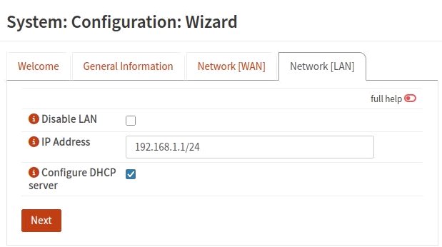 Rien n'a été changé ci-dessus. On peut toujours retrouver ces paramètres dans la page de configuration Interface: [WAN] plus tard. Cliquer sur le bouton [Next] pour voir l'onglet suivant intitulé Network [LAN].