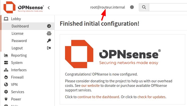 Le message annonçant la fin de la configuration confirme partiellement que celle-ci est déjà appliquée puisque le nom d'hôte du pare-feu est maintenant