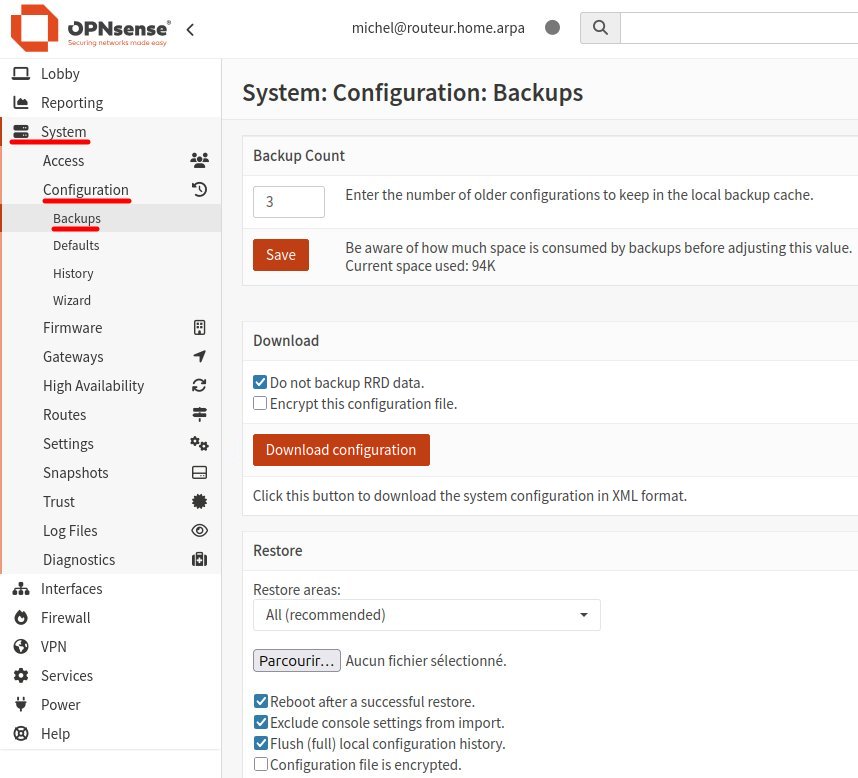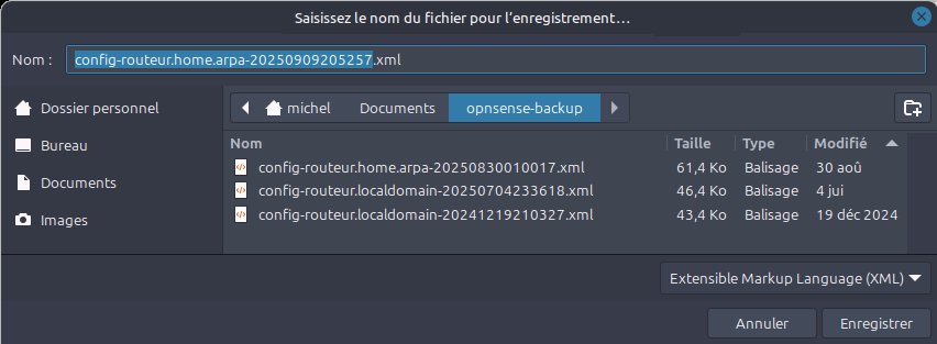 michel@routeur:/ $ ls -l /conf/*xml -rw-r----- 1 wwwonly wheel 70237 Sep 18 20:07 /conf/config.xml michel@routeur:/ $ ls -l /conf/backup total 146 -rw-r----- 1 root wheel 70239 Sep 18 16:22 config-1758223354.3522.xml -rw-r----- 1 root wheel 70238 Sep 18 17:33 config-1758227586.5223.xml -rw-r----- 1 root wheel 70236 Sep 18 17:37 config-1758227853.9664.xml -rw-r----- 1 root wheel 70237 Sep 18 20:07 config-1758236845.4511.xmlLe nombre décimal dans le nom du fichier est son âge mesuré en secondes depuis le 1er janvier 1970, ce qu'on appelle l'heure Unix. Heureusement, quand il est question de choisir une sauvegarde, OPNsense affiche la date et l'heure en temps local explicitement.Je n'ai pas créé les trois plus vielles configurations dans le cache. OPNsense ajoute automatiquement une sauvegarde dans le cache après chaque modification d'un paramètre de la configuration. Souvent des changements au pare-feu exigent la modification de plusieurs options de configuration. Avec seulement 3 sauvegardes dans le cache, il pourrait être impossible de retourner à une ancienne configuration valide en cas d'erreurs. L'expérience indiquera si 16 est une limite plus appropriée.