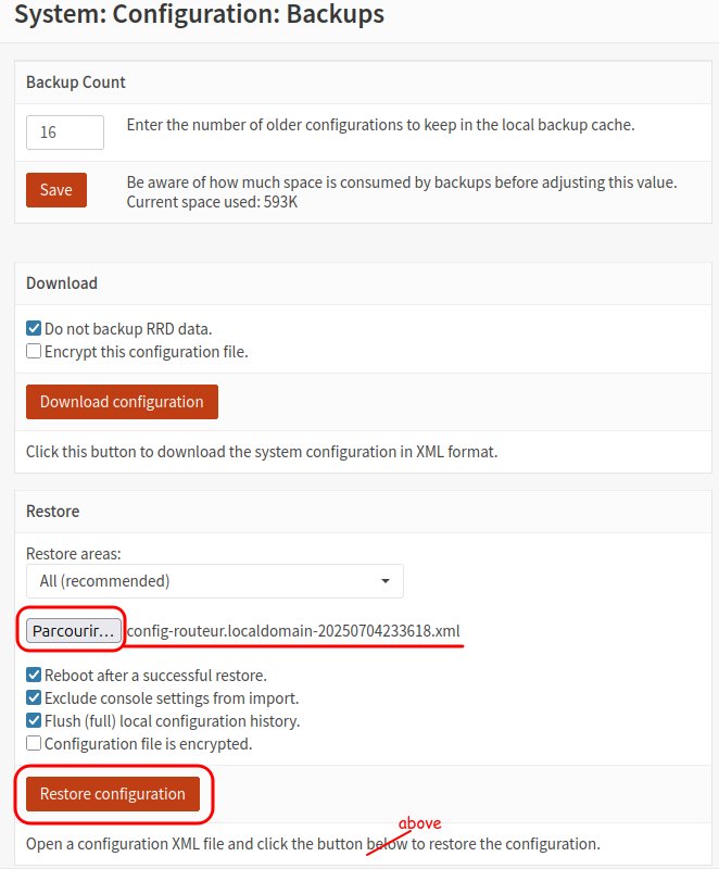 /conf/config.xml. En voici le début.<?xml version="1.0"?> <opnsense> <theme>opnsense</theme> <sysctl version="1.0.1" persisted_at="1756094252.07"> <item uuid="11a37c07-c91a-4d94-94c5-dcda3360d50f"> <tunable>vfs.read_max</tunable> <value/> <descr>Increase UFS read-ahead speeds to match the state of hard drives and NCQ.</descr> </item> <item uuid="42831cc9-4f5a-4bf4-901f-cfeab86c3314"> <tunable>net.inet.ip.portrange.first</tunable> <value/> <descr>Set the ephemeral port range to be lower.</descr> </item> <item uuid="2b173971-f418-4493-a5cc-35707ae89279"> <tunable>net.inet.tcp.blackhole</tunable> <value/> <descr>Drop packets to closed TCP ports without returning a RST</descr> </item>Puisque ce fichier est lu à chaque démarrage du pare-feu, il suffit de le remplacer avec une ancienne version puis d'exécuter un redémarrage (reboot) pour revenir à une configuration antérieure du système. C'est essentiellement comment fonctionne la restauration de la configuration gérée à partir de la page System: Configuration: Backups dans l'interface de configuration d'OPNsense.