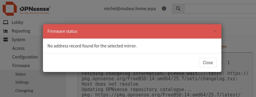 *** routeur.home.arpa: OPNsense 25.7.3 (amd64) *** ... 0) Logout 7) Ping host 1) Assign interfaces 8) Shell 2) Set interface IP address 9) pfTop 3) Reset the root password 10) Firewall log 4) Reset to factory defaults 11) Reload all services 5) Power off system 12) Update from console 6) Reboot system 13) Restore a backup Enter an option: 1Il est probable qu'il aurait été possible de retourner à la dernière configuration qui fonctionnait avec l'option 13, mais comme expliqué ci-dessus je n'avais pas encore compris sa valeur. J'ai plutôt utilisé le shell (l'option 8) pour examiner le système pour essayer de comprendre ce qui n'allait pas, puis l'option 1 pour réaffecté les interfaces LAN et WAN aux cartes de réseau. De là il a été possible d'accéder à l'interface de gestion d'OPNsense et de restaurer la configuration de base du 29 août faite qu'un ou deux jour auparavant.