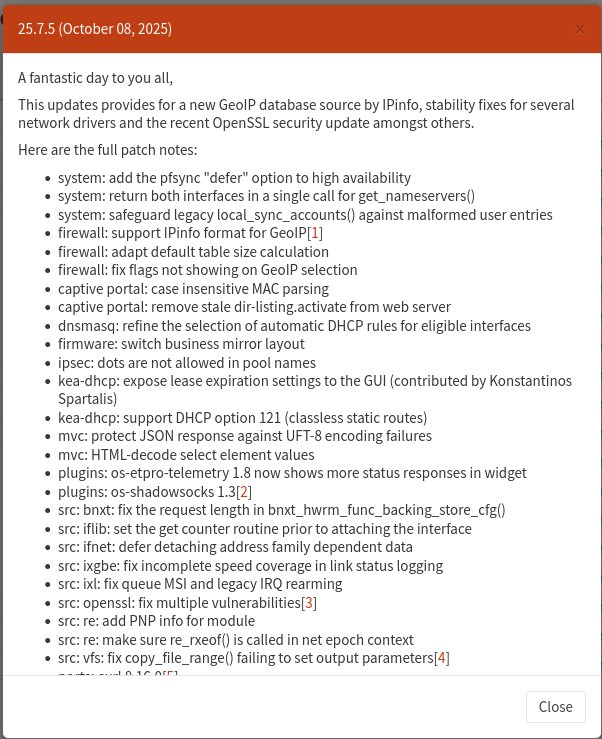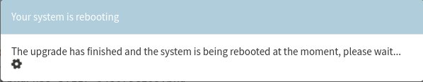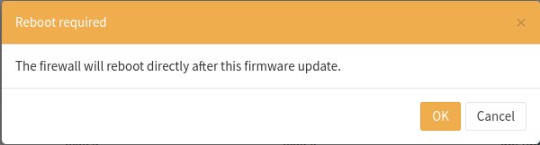 On peut voir ci-dessus le bouton pour lancer la mise à jour, [✔ Update] ainsi que l'avertissement que le pare-feu sera redémarré. Toutefois, s'il s'agit d'une mise à jour importante, le tableau sera masqué par des notes plus détaillées au sujet de la mise à jour.
