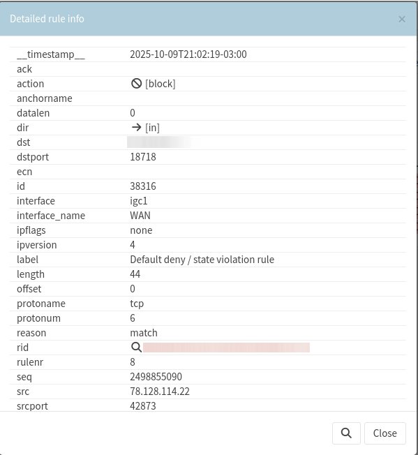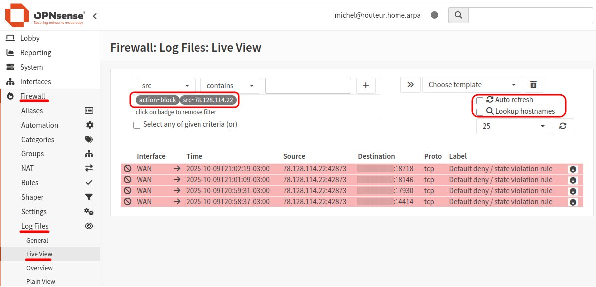 Il est intéressant de voir OPNsense agir comme pare-feu. En examinant la vue en direct de son journal (Firewall: Log Files: Live View) on peut voir les connexions acceptées, rejetées, redirigées et ainsi de suite. En filtrant pour ne voir que les connexions bloquée, j'ai vite repéré de nombreuses tentatives de connexions TCP depuis l'adresse IP