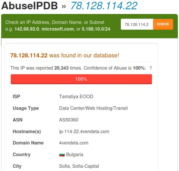 78.128.114.22.En ajoutant un second filtre spécifiant l'adresse IP comme source et en arrêtant le rafraichissement automatique, j'ai isolé quatre tentatives de connexion en un peu moins de quatre secondes. Les ports TCP ciblés sont dans la plage des ports enregistrés, mais ils ne sont pas actuellement affecté à une utilisation particulière par l'IANA. Alors qu'elle peut être la cible ? Intrigué, j'ai consulté AbuseIPDB pour découvrir que cette adresse est associée à des activités en ligne malveillantes depuis deux ans.