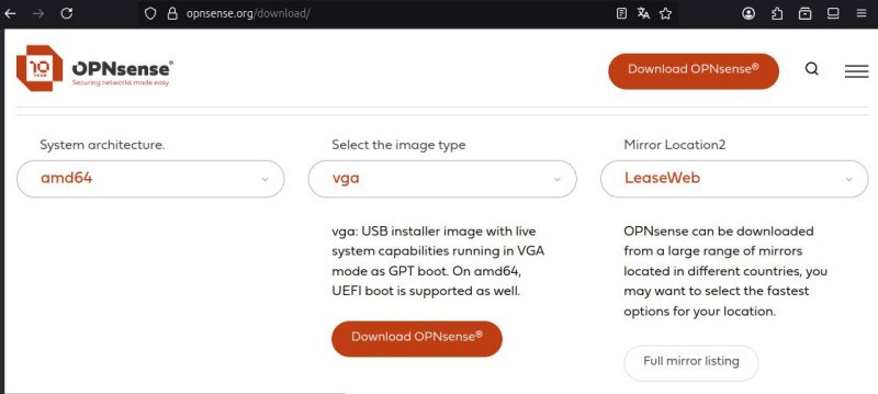 Pour faire une installation à partir d'une clé USB, il faut choisir l'image pour l'architecture amd64 (seule possibilité) et le type vga. Le terme vga est un peu déroutant, car l'installeur d'OPNsense fonctionnera avec tout appareil muni d'une carte graphique, qu'un connecteur vga soit présent ou non. En activant le bouton [Download OPNsense] on télécharge un fichier compressé nommé OPNsense-xx.y-vga-amd64.img.bz2 (où xx.y est la version courante, soit 25.7 le 13 octobre 2025).