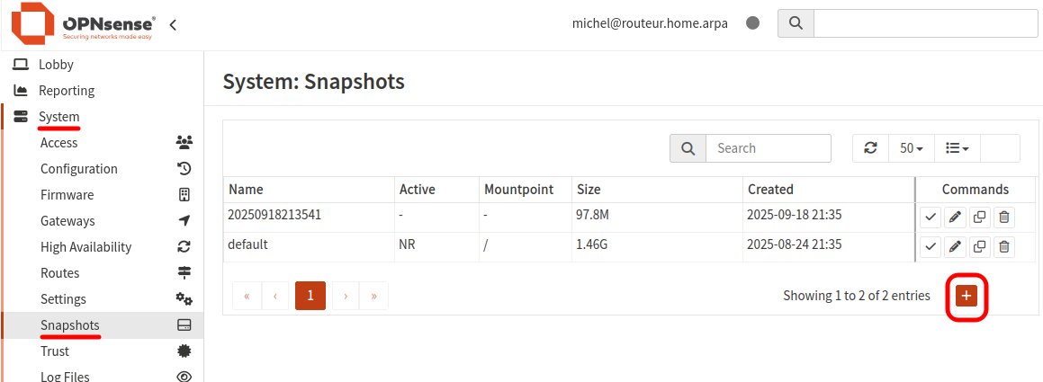 Rapellons que le système de fichiers d'OPNsense est ZFS par défaut ou UFS autrement. Dans les deux cas, il est possible de créer des instantanés du système de fichiers. Cependant, OPNsense ne prend en charge cette possibilité qu'avec ZFS. La rubrique Snapshots d'OPNsense étant claire et complète, me semble-t-il, voici que quelques indications sur l'utilisation des instantanés.