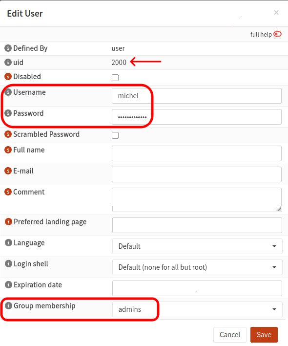 adminsqui est le seul choix disponible. Enfin il ne faut pas oublier de cliquer sur le bouton [Save]. Dès lors, l'utilisateur peut ouvrir une session sur le pare-feu.michel@M7:~$ ssh michel@192.168.1.1 (michel@192.168.1.1) Password: ******** n'est pas affiché à l'écran Last login: Mon Sep 22 19:18:17 2025 from 192.168.1.110 ------------------------------------------------ | Hello, this is OPNsense 25.7 | :::::::. | | :::::::::. | Website: https://opnsense.org/ | ::: ::: | Handbook: https://docs.opnsense.org/ | ::: ::: | Forums: https://forum.opnsense.org/ | ::: ::: | Code: https://github.com/opnsense | `::::::::: | Reddit: https://reddit.com/r/opnsense | `::::::: ------------------------------------------------FreeBSD n'est pas Linux mais ces systèmes d'exploitation ont une racine commune. Plusieurs des programmes qui avaient été créés dans UNIX sont disponibles dans les deux systèmes, dont les utilitaires qui manipulent les fichiers et répertoires: