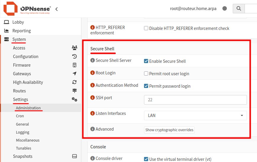 La gestion du pare-feu doit se faire avec l'interface de gestion Web d'OPNsense. En principe, pouvoir ouvrir une session à distance avec le protocole SSH n'ajoute rien alors qu'activer le service SSH augmente la surface d'attaque du pare-feu. Cependant, j'ai ajouté ce service pour deux raisons. Premièrement pour assouvir ma curiosité. Parce que je connais mal FreeBSD, je trouve intéressant de voir un peu comment ce système d'exploitation fonctionne. Deuxièmement, pouvoir accéder au pare-feu si jamais l'interface Web devait devenir inaccessible est réconfortant. En activant le serveur SSH du pare-feu dans la section Secure Shell de la page System: Settings: Administration on obtient cette possibilité.