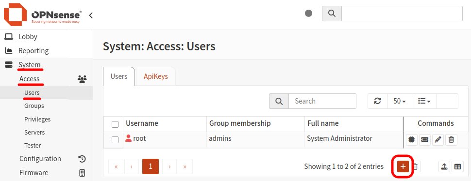 Cela ne donne rien d'activer le serveur SSH s'il n'y a pas d'utilisateur qui puisse accéder à ce serveur. Ajoutons un utilisateur en cliquant sur le bouton [+] dans la page de configuration System: Access: Users.