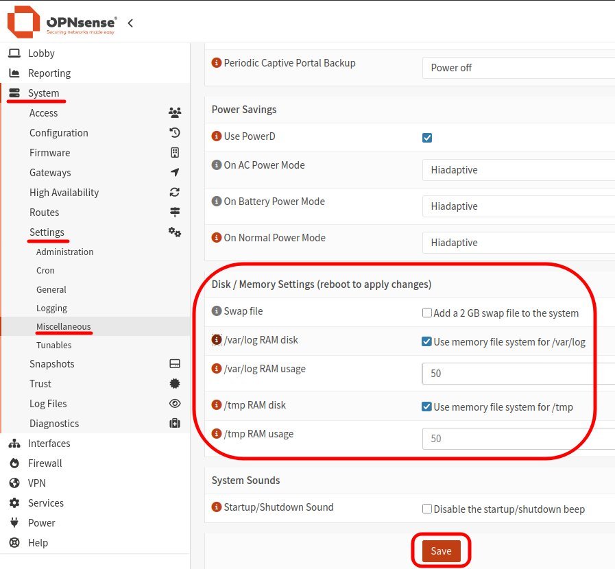 Les nombreuses entrées du journal du système sont sauvegardées sur le lecteur NVMe ce qui pourrait réduire sa durée de vie. Pour diminuer de façon considérable toutes ces opérations d'écriture sur le disque électronique, OPNsense peut monter le répertoire où sont sauvegardé les journaux ainsi que le répertoire