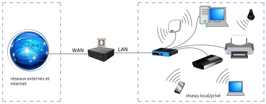Ce billet détaille le processus d’obtention d'OPNsense, son installation sur un mini pc, sa configuration de base et quelques aspects de son utilisation. L'objectif est de créer un réseau local (LAN local area network) protégé par un pare-feu qui contrôle strictement les échanges avec le réseau étendu (WAN wide area network). Seuls certains types de connexions issus du LAN pourront transiter vers l'extérieur : HTTP et HTTPS (accès web), ICMP (messages erreur réseaux et ping), NTP (horodatage) et DNS (résolution d'adresses). En revanche, le pare-feu empêche toute communication non nécessaire entrant du WAN limitant les risques d'intrusion.
