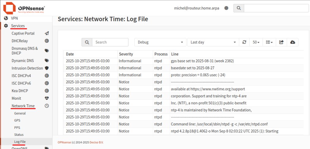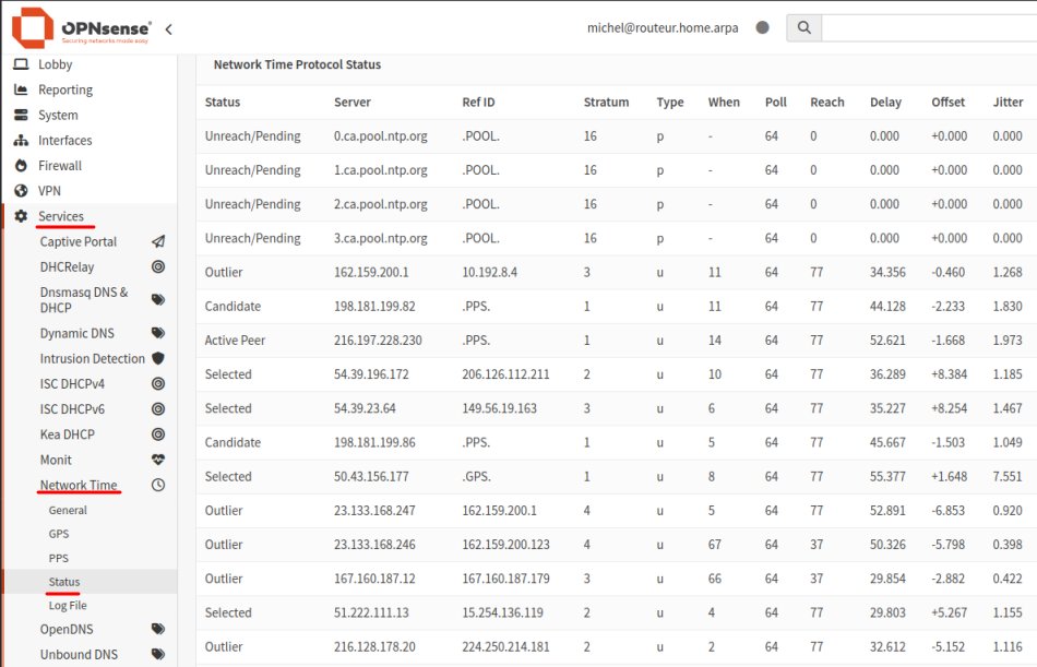 Le statut du service peut aussi être affiché par OPNsense (Services: Network Time: Status).