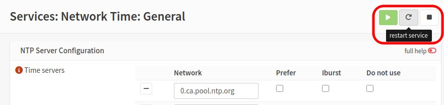 Un pare-feu nouvellement installé est livré avec NTP activé sur toutes les interfaces (le pare-feu bloque alors tout accès hors réseau local), transférant les requêtes vers l'un des serveurs en amontX.opnsense.pool.ntp.org(Xétant l'un des nombres suivants : 0, 1, 2 ou 3).