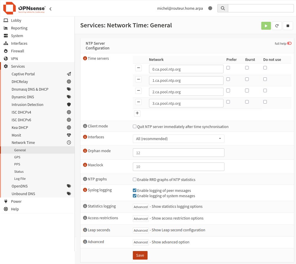 Supposant que les serveurs NTP de référence sélectionnés par X.opnsense.pool.ntp.org sont situés de l'autre côté de l'océan Atlantique, j'ai opté pour les grappes de serveurs NTP X.ca.pool.ntp.org situées au Canada. Sachant que la connexion à [X.]pool.ntp.org se [fait] normalement à des serveurs de temps provenant de votre pays, ou d'un pays tout près du vôtre, il n'est pas clair que mon choix soit bien meilleur que la configuration suggérée par le projet qui gère les serveurs publics. Parce que chacune des grappes 0, 1, 2 et 3.[ca].pool.ntp.org [pointe] vers un ensemble aléatoire de serveurs qui change toutes les heures, il n'y a pas de raison d'en préférer une. Enfin l'option iburst n'est pas invoquée selon la recommandation suivante.