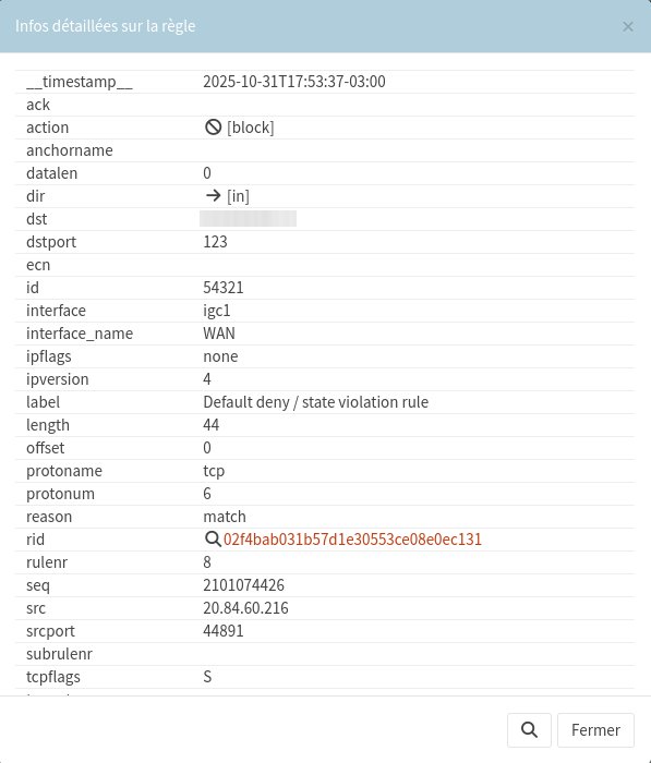On a la confirmation que l'action du pare-feu est de rediriger la requête, mais malheureusement, il n'est pas indiqué vers quelle adresse la redirection se fait. Il est amusant (serait-il plus exact de dire consternant ?) de voir qu'un site externe a tenté de se connecter au service NTP du pare-feu en utilisant le protocole TCP sur le port 123. En voici les détails.