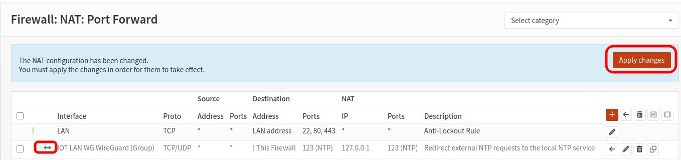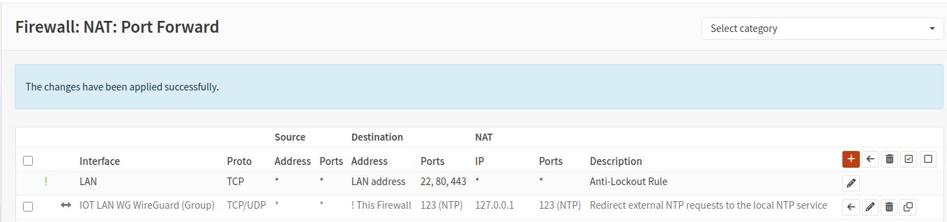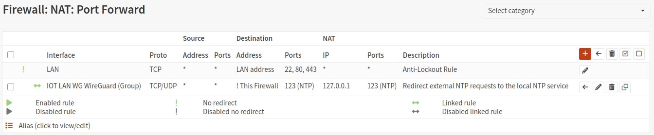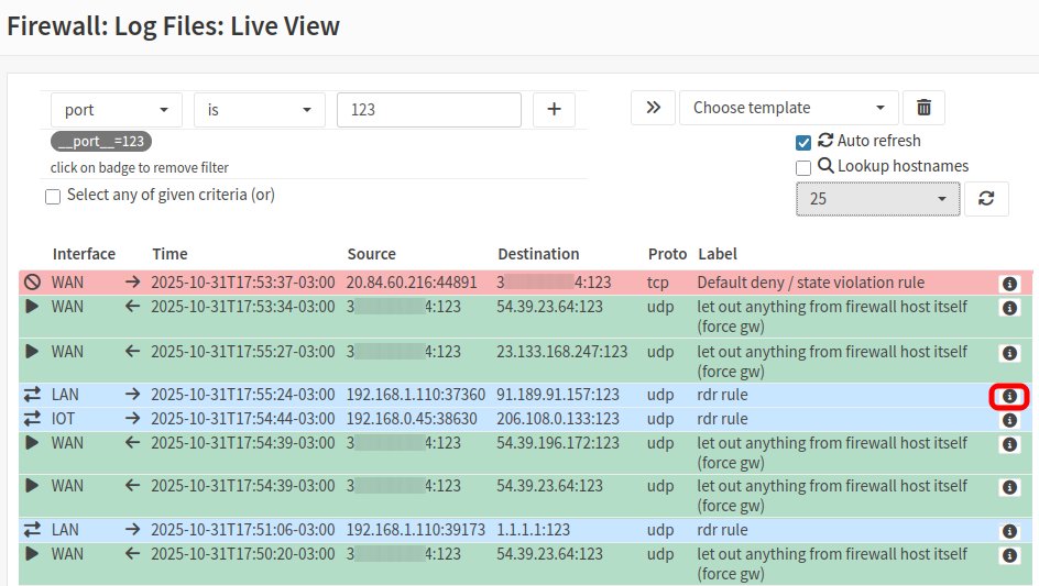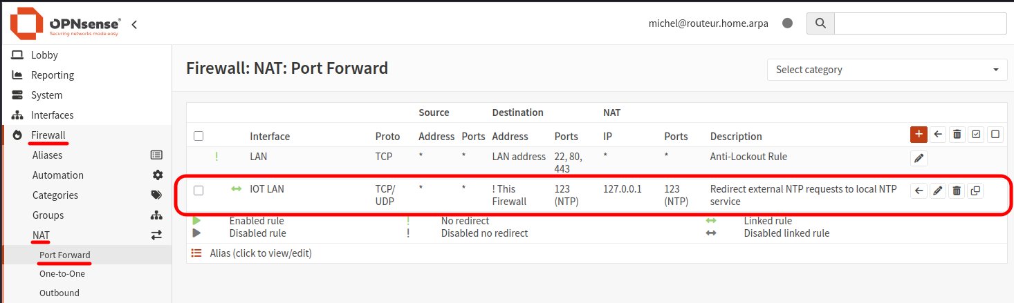 Je supposais qu'il serait nécessaire de reconfigurer tous ces appareils. Il est bien plus facile de les contraindre à recourir au serveur NTP local à leur insu avec une seule règle de routage qui redirige toute requête NTP destinée à un quelconque serveur externe vers au serveur NTP local qui est activé par défaut dans OPNsense. Il suffit de réacheminer tout datagramme provenant d'un réseau interne destiné au port 123 vers le serveur NTP local. Ceci fonctionnera qu'importe l'adresse du serveur de référence ciblé parce que le port 123 est affecté uniquement au protocole NTP selon l'organisme responsable : Internet Assigned Numbers Authority.