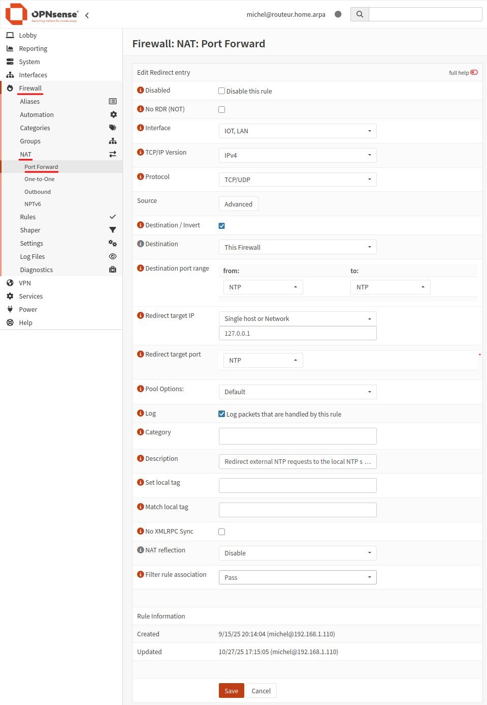 Comme le dit si bien Gabe Miles dans NTP Server in Opnsense ce n'est pas parce que le serveur NTP est actif que les ordinateurs du réseau l'utiliseront. Bien sûr, on peut reconfigurer chaque appareil pour qu'il utilise le serveur de référence local. On peut même le faire à l'aide du serveur DHCP des réseaux locaux, comme j'ai contemplé le faire auparavant. C'est tellement plus simple d'utiliser la règle de redirection de port proposée par G. Miles dont voici la définition complète.