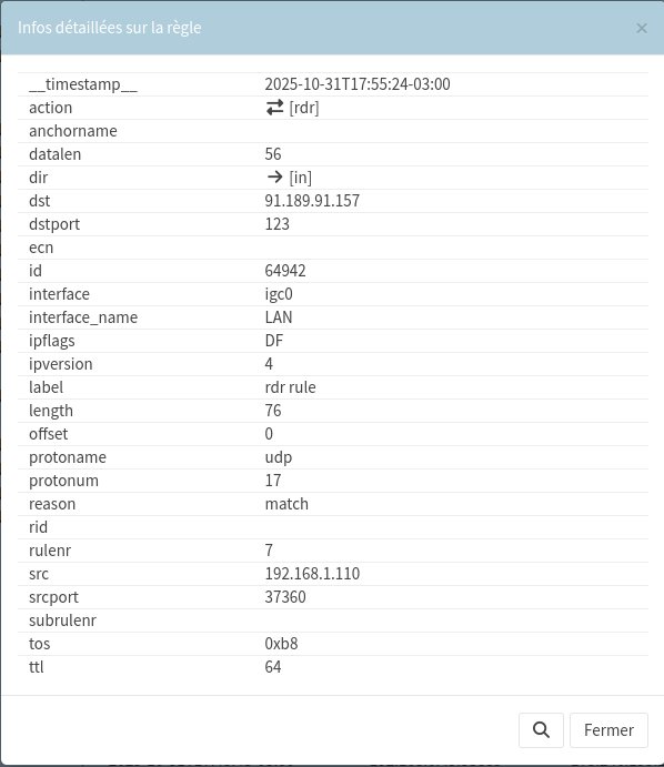 En vert, on peut voir que les requêtes vers des serveurs NTP de référence publics provenant du pare-feu leur sont acheminées via l'interface WAN. C'est ce qui est nécessaire pour que le service ntpd puisse synchroniser l'heure. En bleu, on peut voir des paquets NTP (port 123) encapsulés dans des datagrammes UDP redirigés. C'est que veut dire rdr rule qui représente redirection rule. On sait que ces requêtes étaient véritablement envoyées à 1.1.1.1:123) le serveur DNS de Cloudlare les bloquerait et l'heure ne serait pas synchronisée. En fait le client (ici ntpc) obtient en réalité une réponse correcte qui nécessairement provient du serveur NTP local.