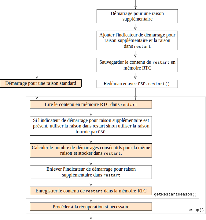 Ci-dessous une méthode pour garder la trace de la raison des démarrages du ESP8266 est présentée. En gros, il s'agit de conserver la raison du dernier démarrage ainsi que le nombre de démarrages consécutifs pour cette raison dans un enregistrement dans la mémoire de l'horloge en temps réel (Real Time Clock ou RTC en anglais).