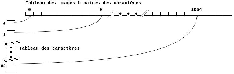 On peut voir les 16 octets du tableau des images des glyphes représentant les deux caractères A et B. Il est très facile de trouver l'image du nième caractère de l'ensemble; elle est à l'index n*7 à partir du début du tableau d'octets où tout est compté à partir de 0.