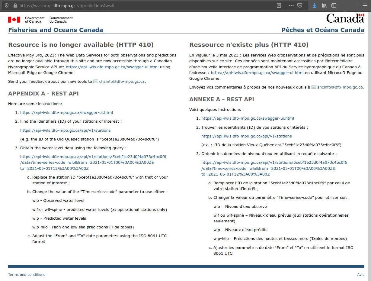 Curieux, j'ai envoyé une requête HTTP à l'adresse https://ws-shc.qc.dfo-mpo.gc.ca/predictions?wsdl comme le faisait le script avec un navigateur. La réponse est un message d'erreur HTTP 410 accompagné d'une explication assez complète sur ce qu'il faut faire pour utiliser la nouvelle interface de programmation.