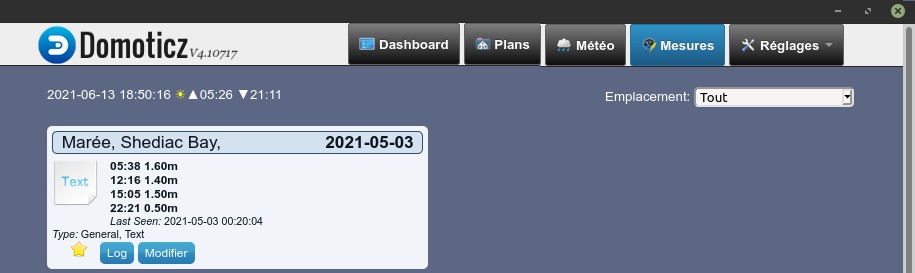 On peut aussi télécharger un script Python semblable, tide5.py, qui transmet les données à un serveur Domoticz pour affichage dans un dispositif texte. Le script original exécuté sur le coup de minuit, mettait à jour les données pour la journée complète comme on peut voir dans la capture d'écran au début du billet. Le nouveau script est exécuté quatre fois par jour et affiche les mers pleines et basses sur une période de 24 heures commençant 8 heures avant le moment de l'exécution.