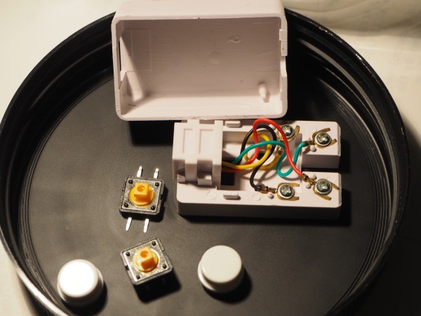 - Inverser le couvercle de la prise téléphonique, placer les boutons-poussoirs avec leur capuchons dans les trous et placer le plastique noir par dessus.