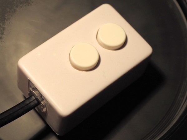 Pour les lampes de chevet de la chambre à coucher, j'ai disposé deux boîtiers de chaque côté du lit, chacun fixé à l'arrière d'une commode faisant office de table de chevet. Chaque boîtier contient deux boutons-poussoirs qui permettent de contrôler chacune des deux lampes. Cet arrangement simple et efficace a obtenu une meilleure cote FAF, (WAF) qu'avait le dispositif X10 plus ou moins fiable qu'il remplace. La photographie, plus grande que nature, montre que le boîtier est en fait une prise téléphonique avec fixation de surface que j'ai modifié.