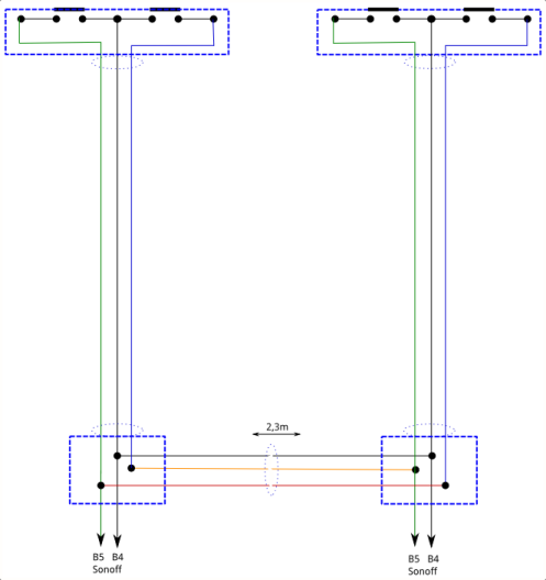 B4 et B5 sont les quatrième et cinquième broches du connecteur du Sonoff (voir le graphique précédent). On peut voir que les mises à terre (0V, B4) des Sonoff sont connectées ensemble avec les quatre boutons-poussoirs. Puis chaque B5, relié à la broche IO libre du ESP8266, est connecté en parallèle à l'un des boutons-poussoirs de chacun des deux boîtiers.