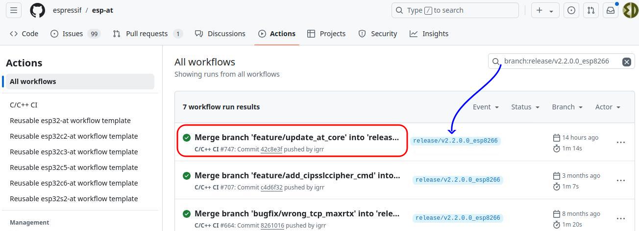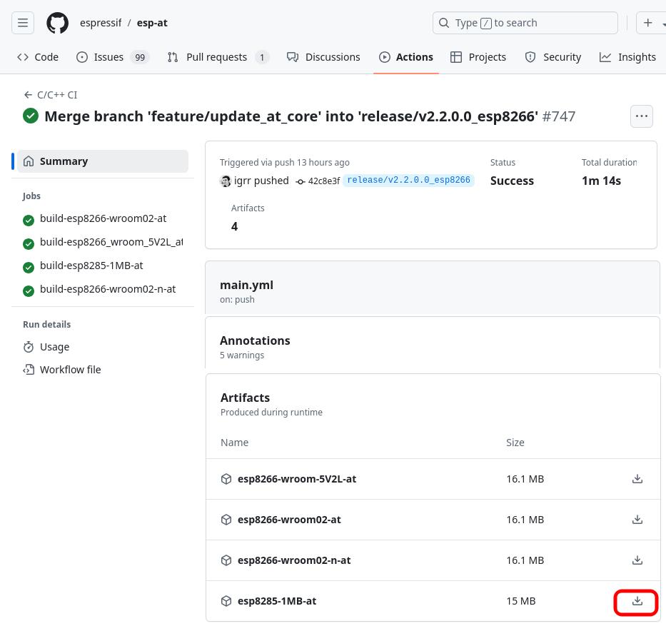 - Click on the download icon of the esp8285-1MB-at artifact.