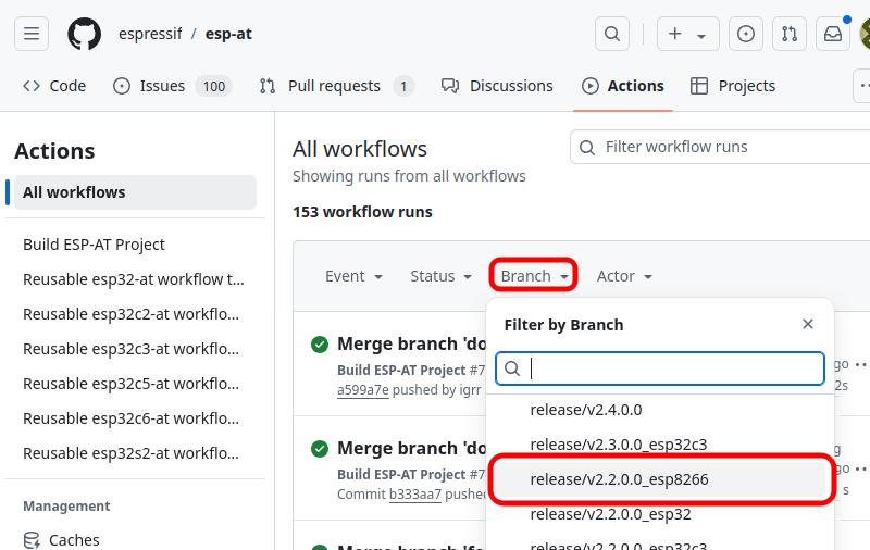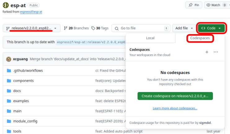 didn't allow me to understand precisely how to select the correct branch in step 2. So for future reference, here is how I created a codespace on the appropriate branch of the ESP-AT repository.